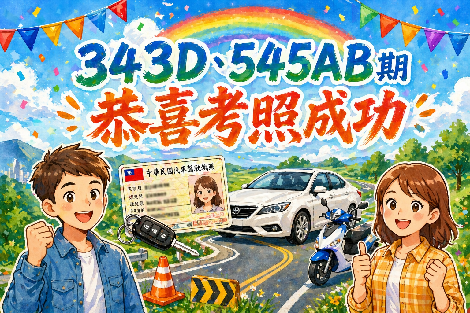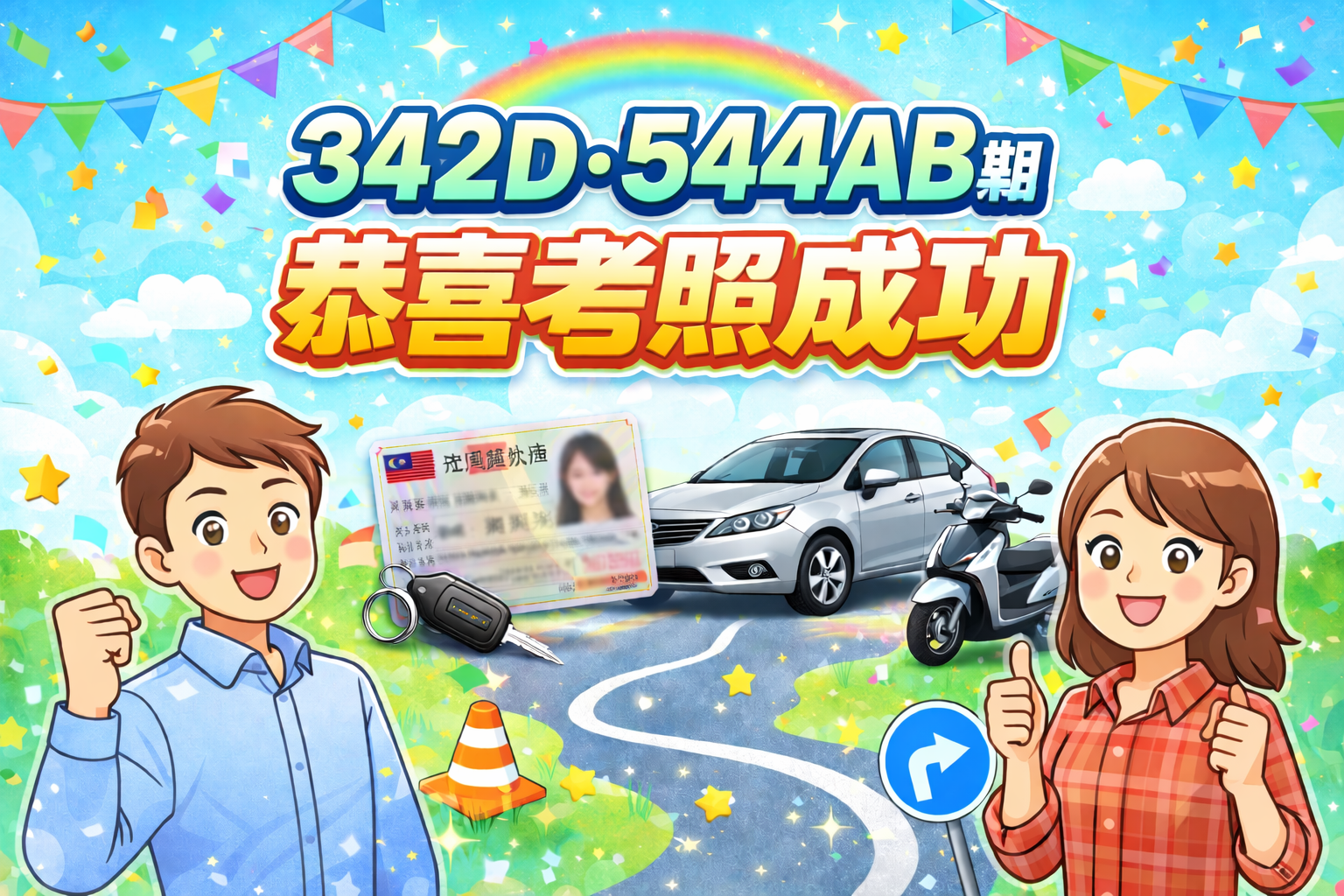 336D、538AB期(考試日期:3/5)恭喜考照成功!駕照已可領取,記得帶有照片的證件來領取~地點:大龍港駕訓班(221新北市汐止區忠一街9巷12號)營業時間:週一至週五: 06:00~20:30週六、日及國定假日: 09:00~16:00