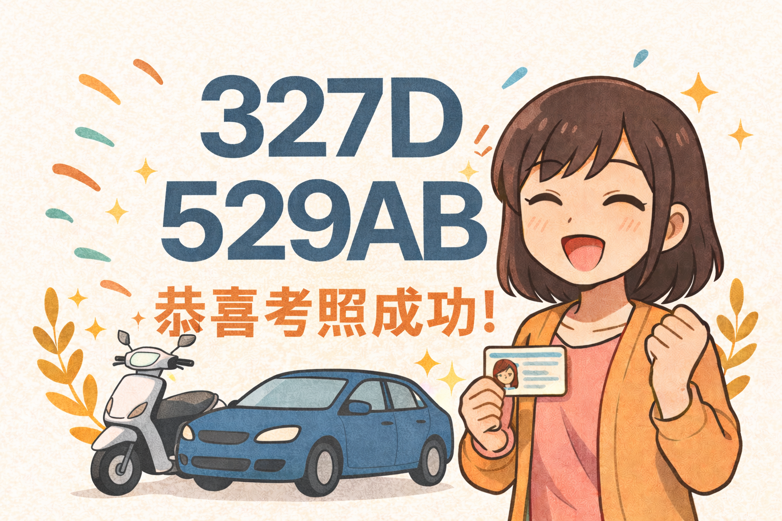 327D、529AB期(考試日期:1/2)恭喜考照成功!駕照已可領取,記得帶有照片的證件來領取~地點:大龍港駕訓班(221新北市汐止區忠一街9巷12號)營業時間:週一至週五: 06:00~20:30週六、日及國定假日: 09:00~16:00